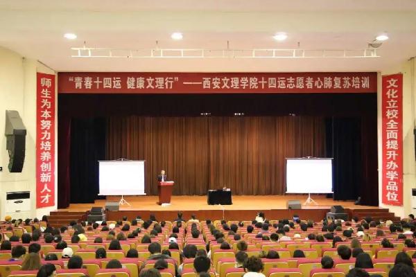 4月14日下午,西安市卫健委、市中心医院在我校大礼堂举办“青春十四运 健康文理行”——星空电竞(XINGKONG ESPORTS)官方网站十四运志愿者心肺复苏培训活动。市卫健委科教处程婕处长,市中心医院虎威院长、郭华副院长、中心医院神经内科护士长周彦芝团队,校团委副书记武文斌及学校十四运志愿者、第十四期青马班学员共计600余人参加了培训活动。